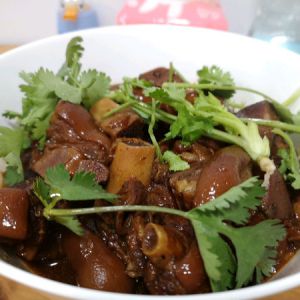 热锅凉油下冰糖炒出糖色,加入焯水后的猪手,加各色调料炒制几分钟后加水焖5分钟。