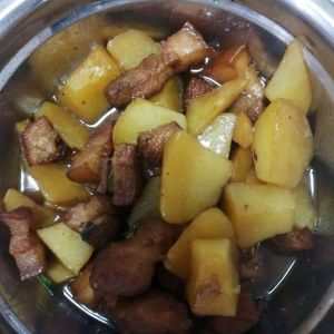 锅里剩一些油把冰糖放进去,翻炒直到炒出糖色后把备用的五花肉放进去。翻炒一下让它们全部粘上颜色。依次放生抽,料酒,盐烧一壶开水往锅里倒入漫过肉即可。大火烧开后转入小火炖。放入切好的土豆。盖上盖子40分钟左右后收汁出锅。