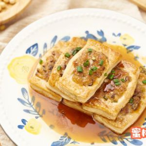 锅里倒20g油烧热,油热后,将豆腐有馅的面朝下放入锅中,中小火煎2分钟左右至肉馅定型、豆腐微微焦黄即可翻面