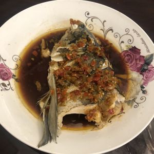 把鱼头翻个面,正面朝上,冷水下锅,水开蒸3分钟,拿出来,把底下的水倒掉