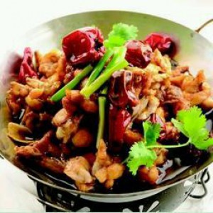 锅烧热,倒五香油,油热后放火锅底料和郫县豆瓣炒出红油和香味,倒入葱姜蒜和红灯笼椒,加入所有食物,放料酒和糖,快速翻炒。