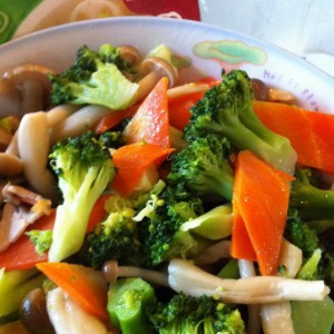 热油下胡萝卜与肉片炒8成熟加入之前焯水的西兰花与小蘑菇,加入200ml白开水,放入浓汤宝翻炒待出锅