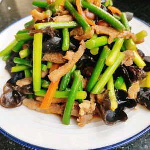 放入木耳,蒜苔,胡萝卜 翻炒均匀