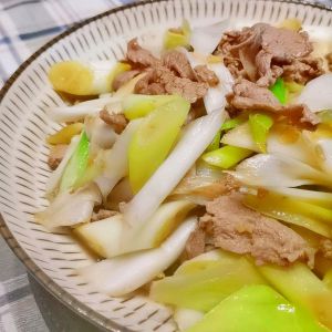 3. 大葱洗净只要葱白部分,用厨房纸巾吸干水分,葱白切成滚刀块,然后用手把葱块的每层葱皮剥开,使其呈松散的片状(这样便于受热均匀熟的也快,用这种处理大葱的方法,葱下锅后可立即断生还不易塌秧,吃起来会有清脆感);