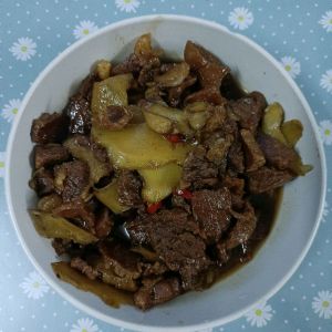 4.捞出肉滤干水,锅开下姜片炒香再把肉翻炒一会加生抽,蚝油,胡椒粉,盐,再加上水焖40分钟(看肉大小),为了方便孩子吃我切的比较小,炖的时间就不用那么久,尝试一下差不多软烂就可以加黄糖片,小米辣,等糖融化之后就可以收汁了