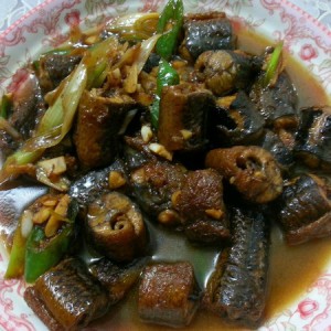 油烧至7成,放入鳝段断生,加豆瓣、姜片、葱段炒香,加酱油、盐、大蒜、杭椒翻炒,加少许水,淀粉收汁后起锅装盘
