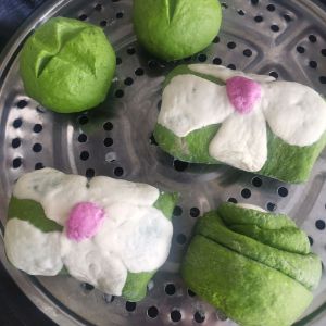 绿色擀成饼,白色花瓣我用瓶盖扣成圆形又用手抻一下