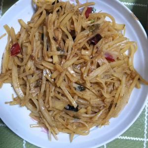 锅里放入土豆丝,大火爆炒,放入适量水转小火,焖一小会,放入醋,少量白糖,中火再炒,出锅前放盐,也可再倒入少量味极鲜。