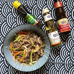 面条控干水分,将黄瓜胡萝卜鸡胸肉花生碎依次放进碗中,倒入调好的料汁。鸡丝凉面就做好啦。