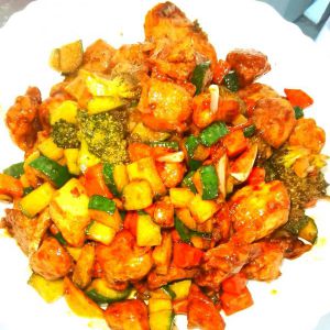 倒入炸好的鸡丁与蔬菜,翻炒搅拌均匀。