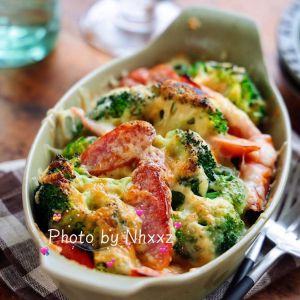 把西蓝花和香肠放在耐热烤盘里,均匀撒盐,黑胡椒粉,蛋黄酱,最后放芝士~然后放入预热好的烤箱~180度烤15分钟~芝士上色就可以了