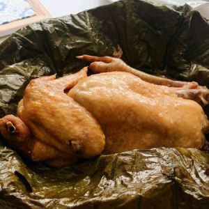 另外重新在鸡肚子那面放入姜,葱结,香叶和火腿肉。