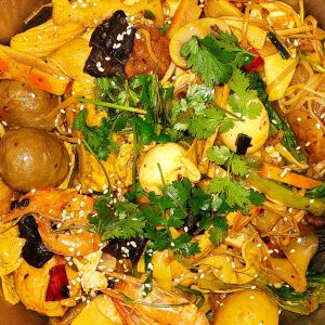 底料炒好后,将已经处理好的食材下锅翻炒。如果底料放的比较少的话,可以加一些食盐调味。一些非常容易熟的,比如生菜香菜就不需要提前焯水,直接炒的时候放进去就可以。