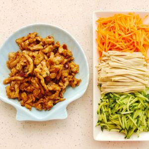 翻炒均匀就可以出锅了,还可以撒点白芝麻,我忘记了,再切点胡萝卜丝、黄瓜丝、豆皮丝(豆皮切之前记得先焯水哦),再烙几张薄饼卷着吃。