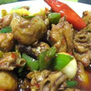 将腌制的鸡肉倒入锅内,划开。待鸡肉稍变色的时候加入少许酱油,少许盐,糖,继续翻炒后,可加上锅盖闷3-4分钟。