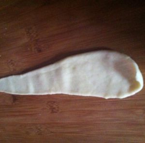 逐个搓成胡萝卜型,擀成片状(不要太薄)