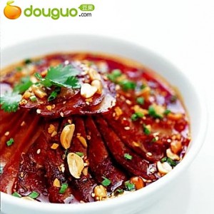 将熟花生米拍碎待用,再将晾凉的牛肉、牛杂等切成片约6厘米长、3厘米宽的薄片混合在一起,淋上味汁拌匀,分盛若干盘,分别撒上芝麻粉和花生仁末即成。