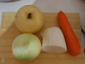 梨、白萝卜、胡萝卜、白圆葱洗干净切丝备用。