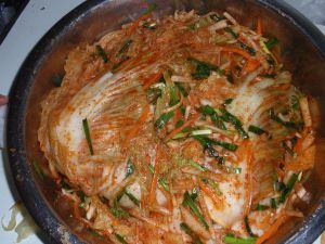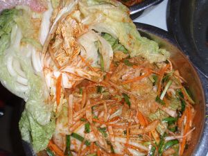 先拿一半白菜放盆里,把拌好的配料一层一层抹在白菜上。
