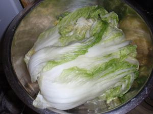 清水倒在盆里,把白菜一层一层加盐腌5个小时,把水挤干。