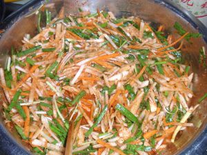 把所有切好丝配料放进辣椒面的盆里拌匀。加糖,雪碧拌匀