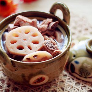 莲藕去皮,切片;排骨先放入滚水中煮一会儿,然后会清水冲去浮沫;