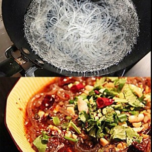 煮熟粉条,加入调料碗,调味:醋,盐,味精,酱油,洒上花生碎,香菜,香葱,酸豆角,榨菜末,根据自己喜好添加