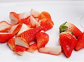 草莓用盐水浸泡15分钟,清水洗净用软毛刷刷干净控干水分切成小块