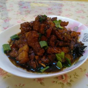 把锅烧热加入少量的油,把八角,干辣椒,姜炒香。把五花肉倒入一起翻炒。翻炒一会加入一勺盐鸡精,一勺半白糖,酱油两小勺炒出糖色。在倒点料酒去肉惺围。少量清水放入锅中。中小火闷二十几分钟!想颜色好看可以加少量红糖提色。