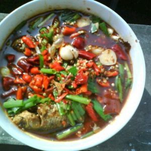 中火将干辣椒花椒豆瓣等炒香后,翻动鱼身,使鱼身尽量裹满调料汤汁,放入清水,和醋,刚没过鱼身最佳