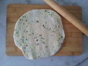 拿出面团.再次揉成圆后.擀成薄片.一定要薄一点!!