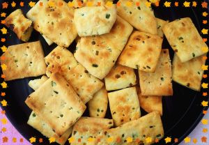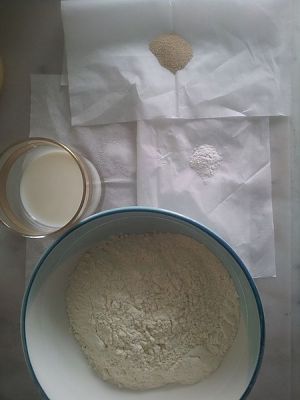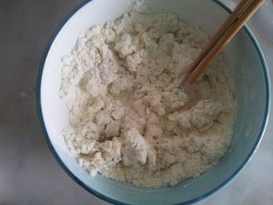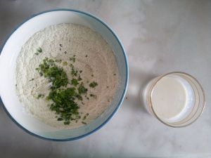 将酵母粉倒入温牛奶中,静置5分钟.把盐,小苏打低粉葱末均匀混合