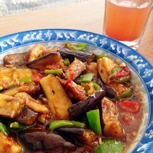 烧热锅,留底油,放入葱蒜炝锅,然后放入青辣椒,呆辣椒变软,放入西红柿,煸炒后 放入茄子,最后放入调味汁。翻炒后出锅。