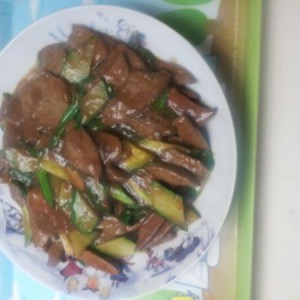 热锅凉油下入姜片蒜片爆香,将猪肝放入锅中滑散翻炒烹入白酒,放入盐、糖、生抽翻炒。