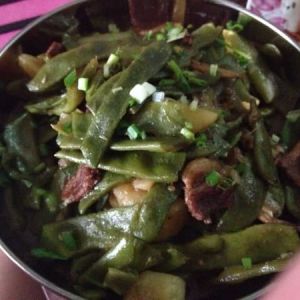 翻炒至肉基本熟,加入豆角翻炒至豆角青色,加入一大碗水,盖上锅盖炖20分钟左右