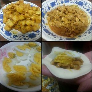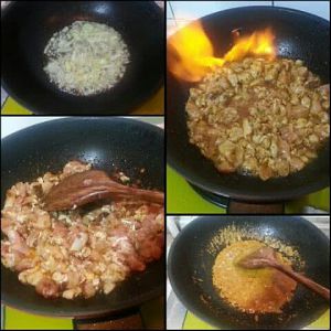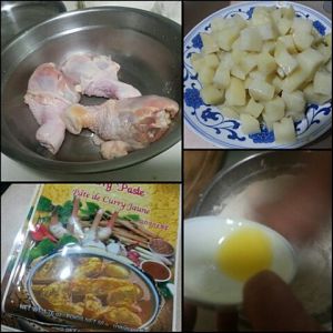 热锅凉油炒葱姜,捞出,下咖哩酱,加适量牛奶稀释,下鸡块,烹少许酒。捞出鸡块后,加入咖哩酱,牛奶,炒土豆