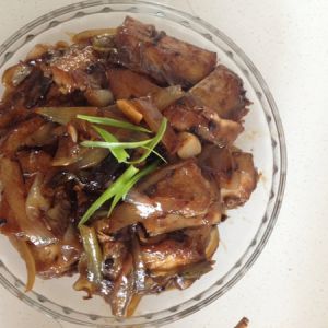 水开后调小火放入煎好的带鱼!盖锅盖小火炖至收汁!