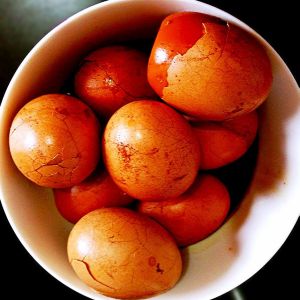鸡蛋敲裂,放入锅中,放入茶包,茴香,加入水,继续煮