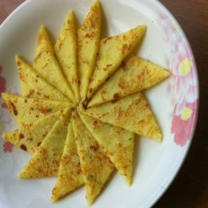 先来个小的,平底锅少少的油,土豆面糊放一勺子下去用勺子背面压平,煎一会表面凝固后,晃动锅翻面再煎一会。闻到一股浓浓的土豆鸡蛋的味道就差不多熟了