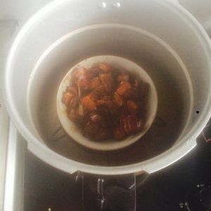 煮到啤酒快干的时候,依照自己的口味放入冰糖,等糖化了把肉用碗盛起来,放进高压锅里蒸!