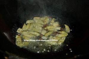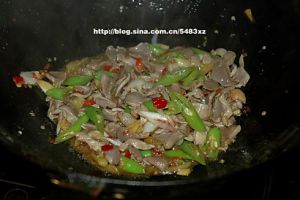 加入青椒,大葱,翻炒,加少许老抽,醋调色后炒至青椒断生, 淋少许麻油即可起锅装盘。