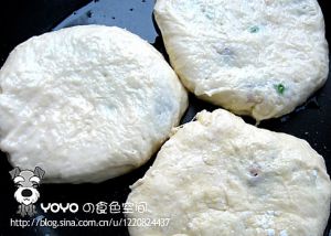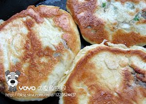 戴上透明料理手套包馅饼(不然面太软包不起来),很容易就包成个团,热锅热油放入,用手压扁