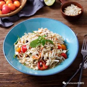 KitchenAid 抬头式厨师机安装食物切碎机配件,选用反切式切盘-粗丝刀面,厨师机开启4档,依次放入青木瓜块、黄瓜切成丝后备用