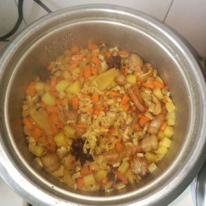 加入两平碗热水,将肉闷煮一会后,与香菇,土豆,胡萝卜一起加入电饭煲中,打至煮饭档。