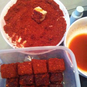 把盐'辣椒粉'花椒粉'胡椒粉'调和均匀'白酒倒入碗中'