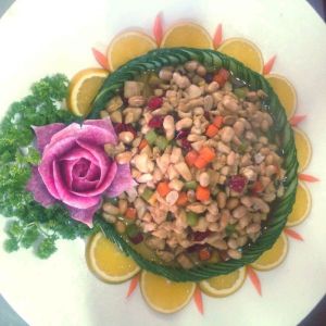 锅底留油 蒜姜爆香 主辅料一起翻炒 最后加入勾好的芡汁,装盘加入五香花生即可。