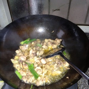 现在,就可以放入刚刚炸好的鸡块,观察青辣椒快要奄的时,就可以进行调味咯''
