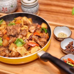 鸡肉中火煮至8成熟加入土豆丁,小火慢炖…
