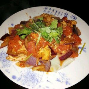 鸡蛋液煎熟 下入番茄和洋葱 炒出红油 加入小碗水 和所有调料 即可