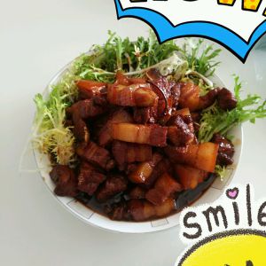 装盘。把肉倒到苦菊上。(我临时找了一些苦菊铺到盘底了),这样美味的红烧肉就完成了。